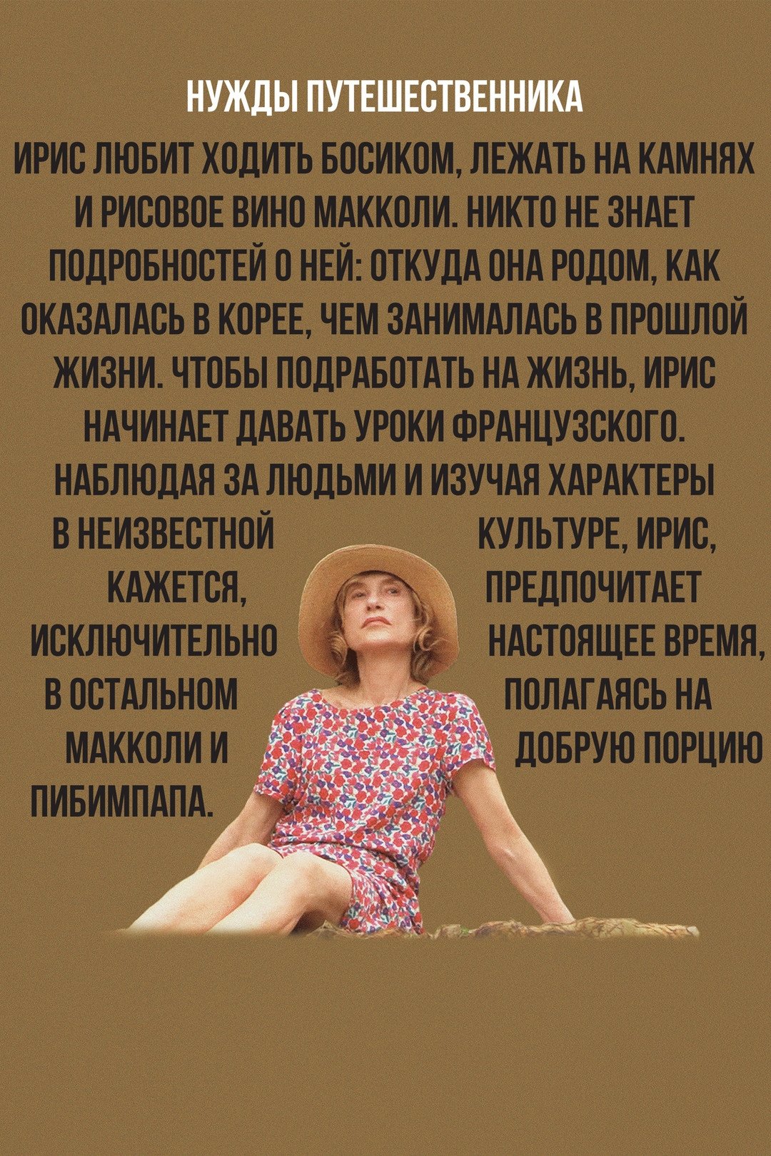 Iris, a woman abroad in Seoul, teaches French and English in an idiosyncratic fashion that allows her to pursue her own philosophical and personal interests. Through four encounters over a single day, Iris probes students and strangers for information about poetry, their own histories, and their relationship to their egos.