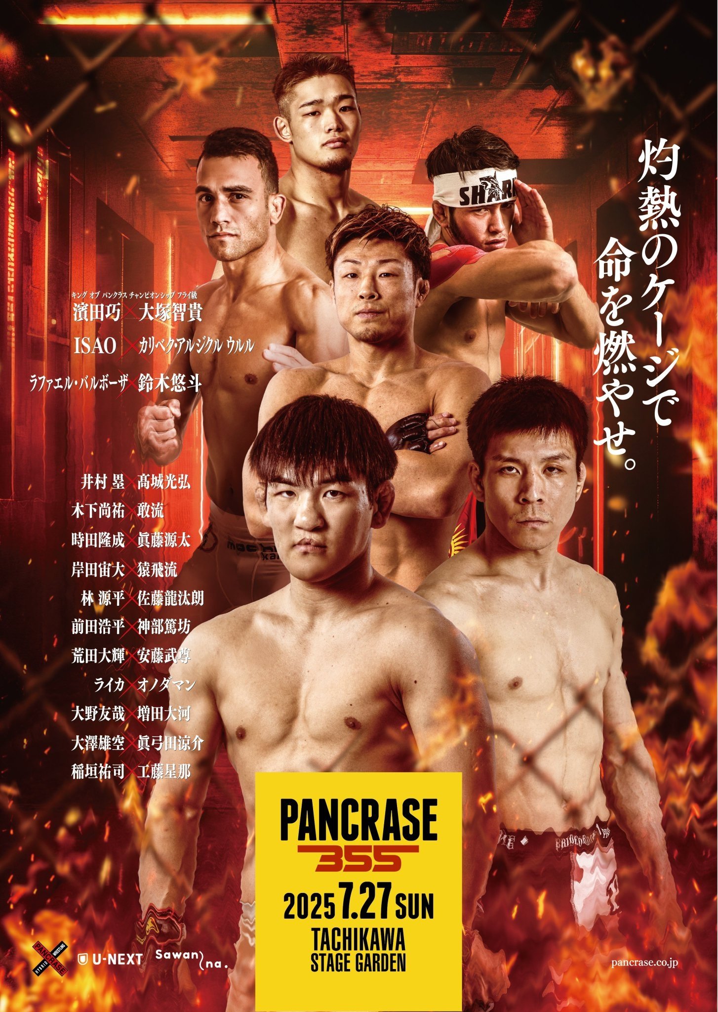 PANCRASE 355 takes place on July 27, 2025, at Tachikawa Stage Garden in Tachikawa, Tokyo, Japan. This mixed martial arts event features 10 bouts in a cage enclosure. Key fights include Isao Kobayashi vs. Kalybek Arzykul Uulu in the featherweight division, Rafael Barbosa vs. Yuto Suzuki at lightweight, and Hiroto Kishida vs. Satoru Enomoto at flyweight.