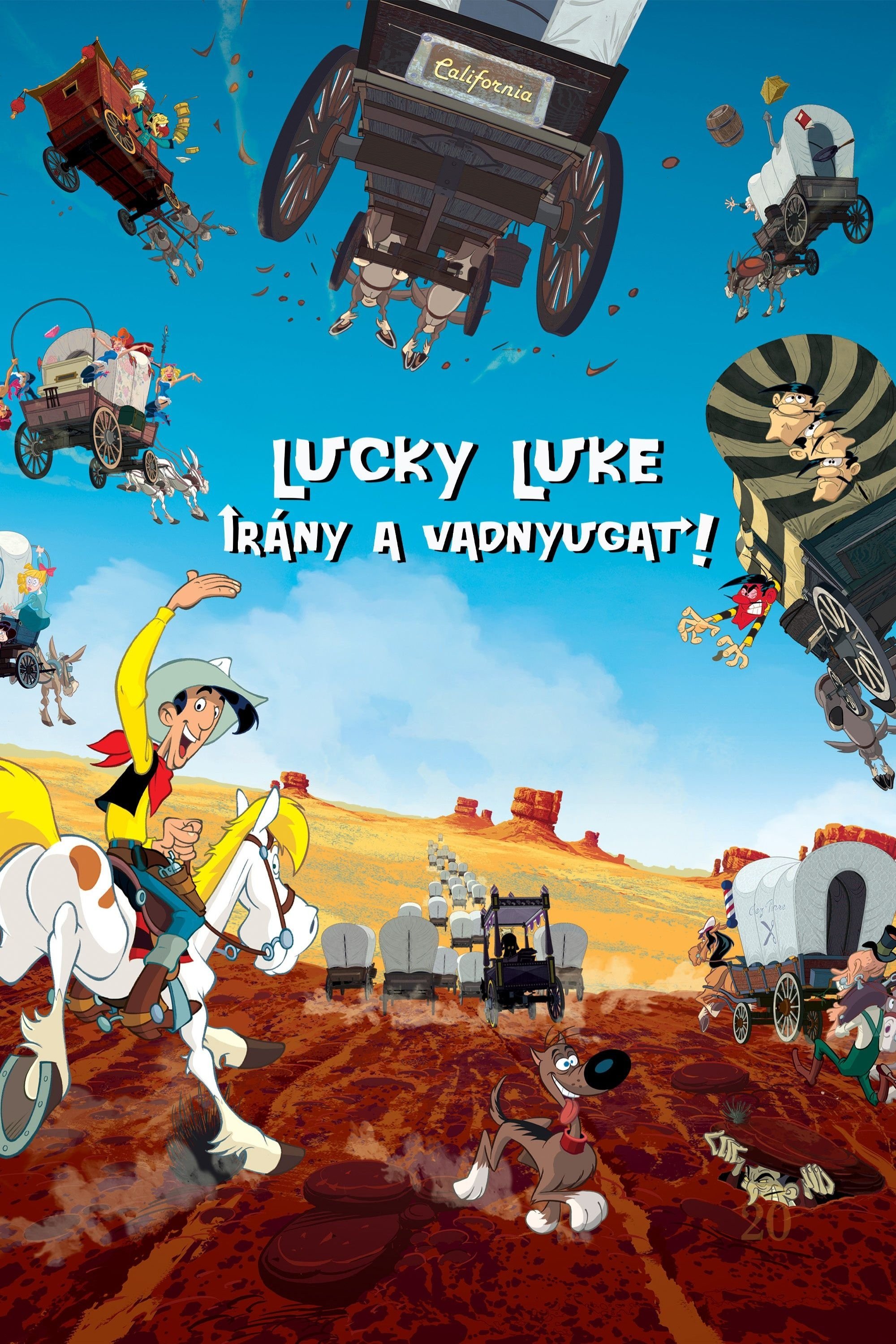 The Daltons have escaped to New York, where their accumulated loot is hidden in the carts of Monsieur Pierre's group of honest, naive European immigrants, who naively bought land in California from Crook, who inserted a clause they must claim it within 80 days. Joe emotionally blackmails Luke to guide them there, hoping to escape on the way. The usual route must shortened from 6 to 2 months, so no danger can be avoided. Given Lucky's reputation, Crook decides to shadow them to add sabotage, just to be sure- or is it?