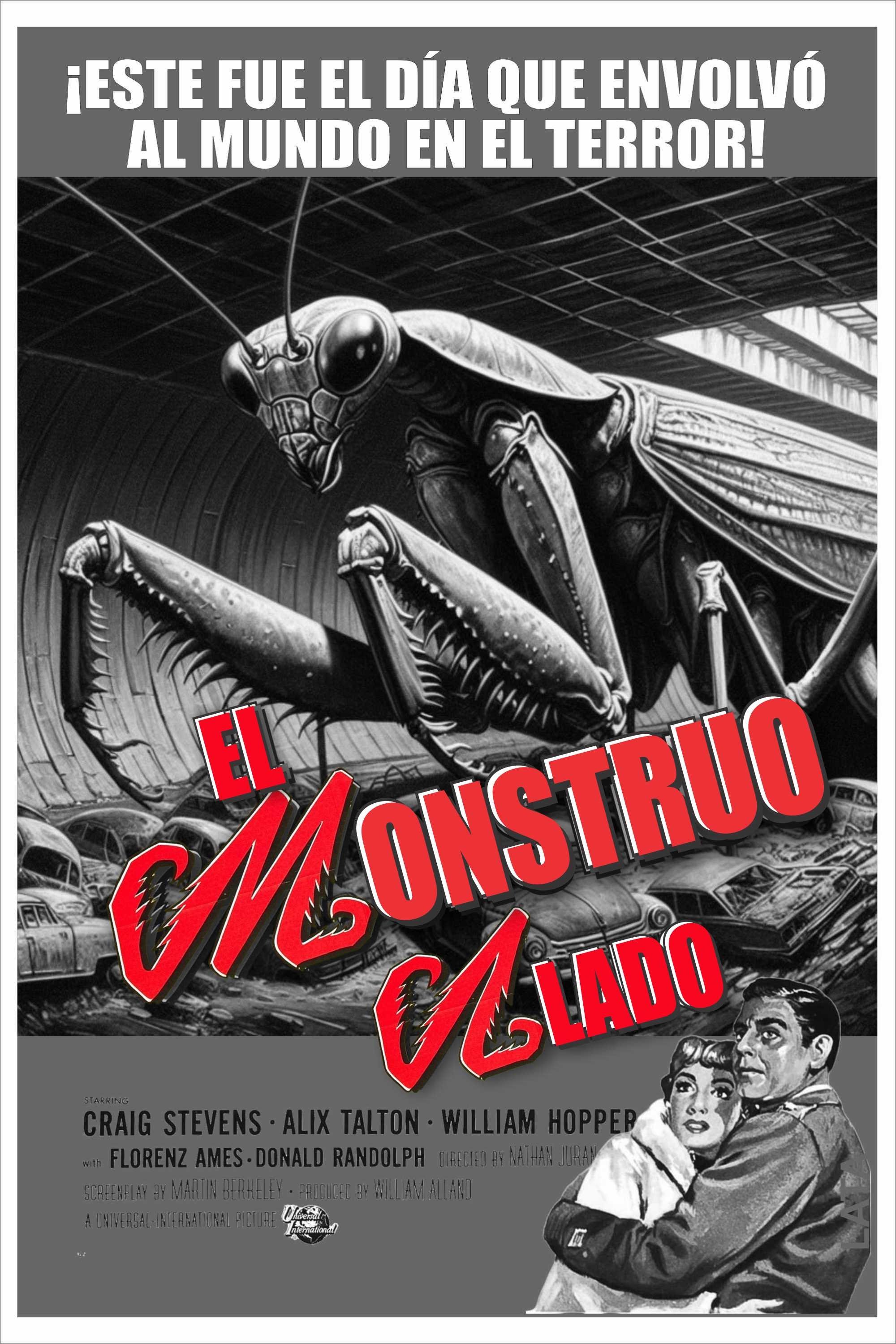A giant prehistoric praying mantis, recently freed from the Arctic ice, voraciously preys on American military at the DEW Line and works its way south.