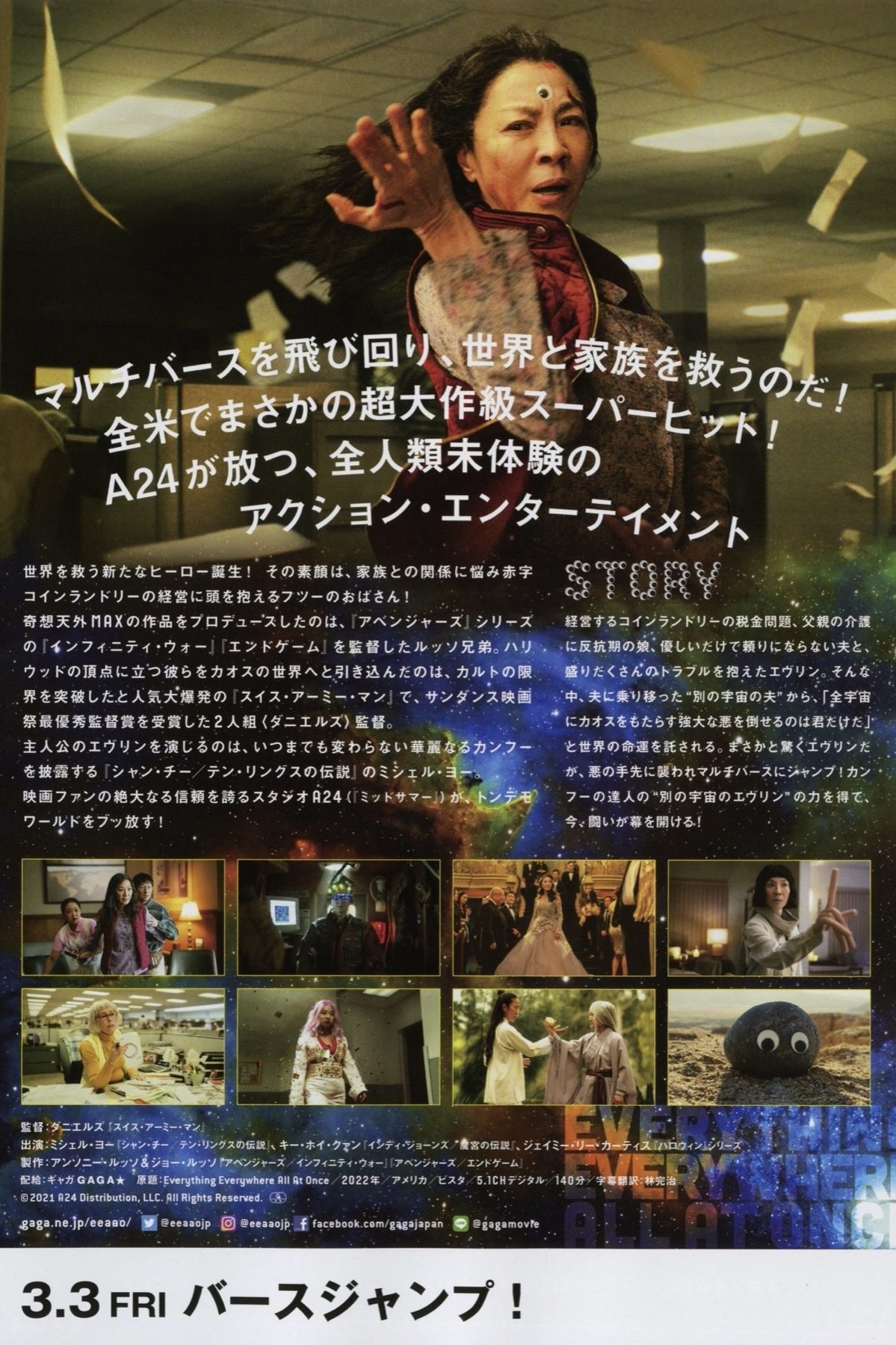 An aging Chinese immigrant is swept up in an insane adventure, where she alone can save what's important to her by connecting with the lives she could have led in other universes.