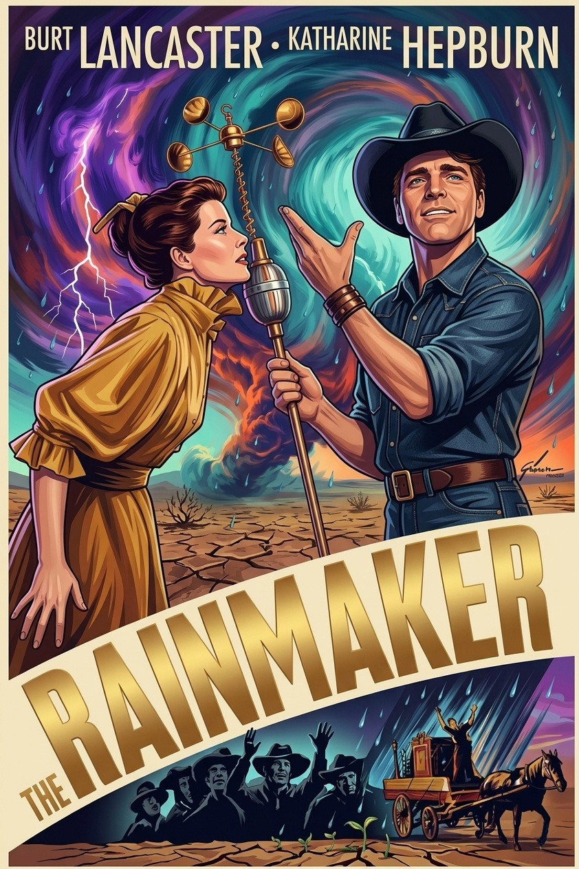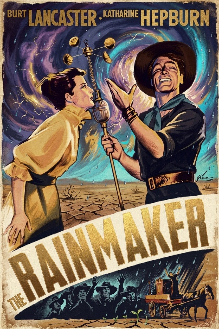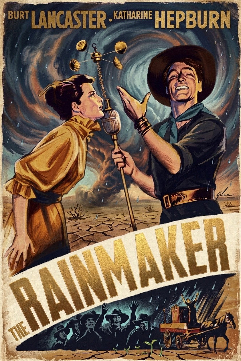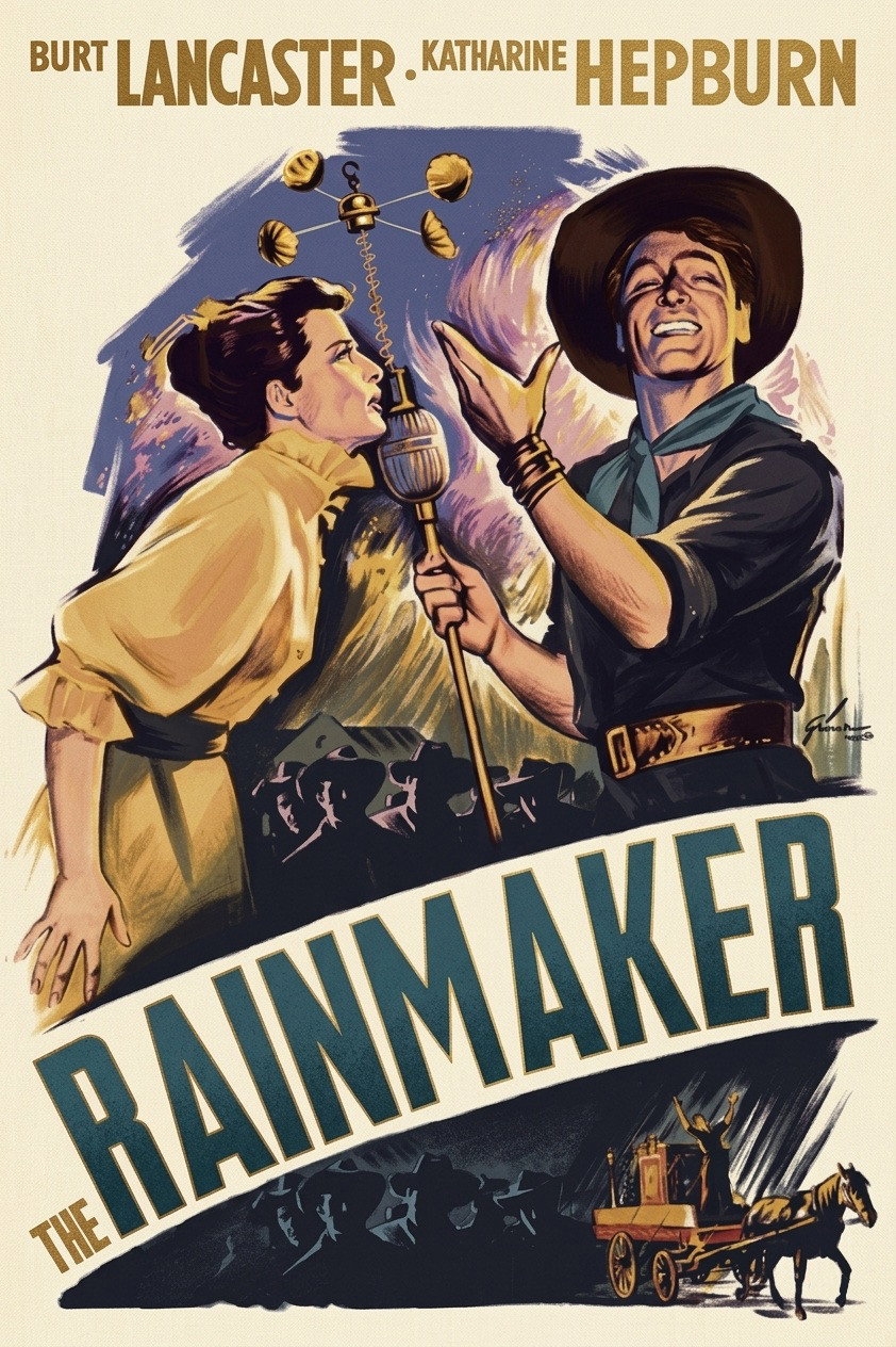 Lizzie Curry is on the verge of becoming a hopeless old maid. Her wit and intelligence and skills as a homemaker can't make up for the fact that she's just plain plain! Even the town sheriff, File, for whom she harbors a secrect yen, won't take a chance --- until the town suffers a drought and into the lives of Lizzie and her brothers and father comes one Bill Starbuck ... profession: Rainmaker!