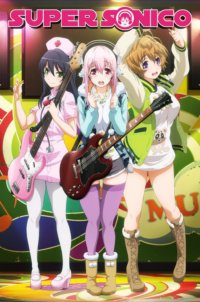 Super Sonico is a clutzy, adorable, and well-endowed 18-year old girl. She's a complete sucker for anything cute, especially stray cats, all of which she giddily adopts. However, though Sonico should be enjoying a carefree and simple lifestyle as a young college student, her life is really anything but easy: she must balance being a professional model, working part-time at her grandmother's restaurant, and practicing guitar and performing concerts with her friends Suzu Fujimi and Fuuri Watanuki in their band, First Astronomical Velocity—all while attending college. SoniAni: Super Sonico the Animation follows Sonico as she faces daunting challenges in her search for her place in the world, even when her days are brimming with love and happiness. Source: MyAnimeList